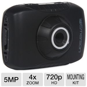 This is an Emerson ActionCam 720p HD Digital Video Camera with waterproof case and 2 camera mounts.